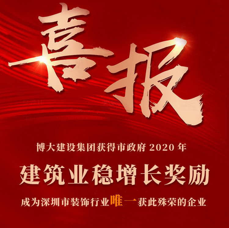 博大建設(shè)集團榮獲深圳市政府2020年建筑業(yè)穩(wěn)增長獎勵,博大是獲此殊榮的唯一一家裝飾企業(yè),當(dāng)之無愧成為深圳市的行業(yè)龍頭,為行業(yè)爭光。