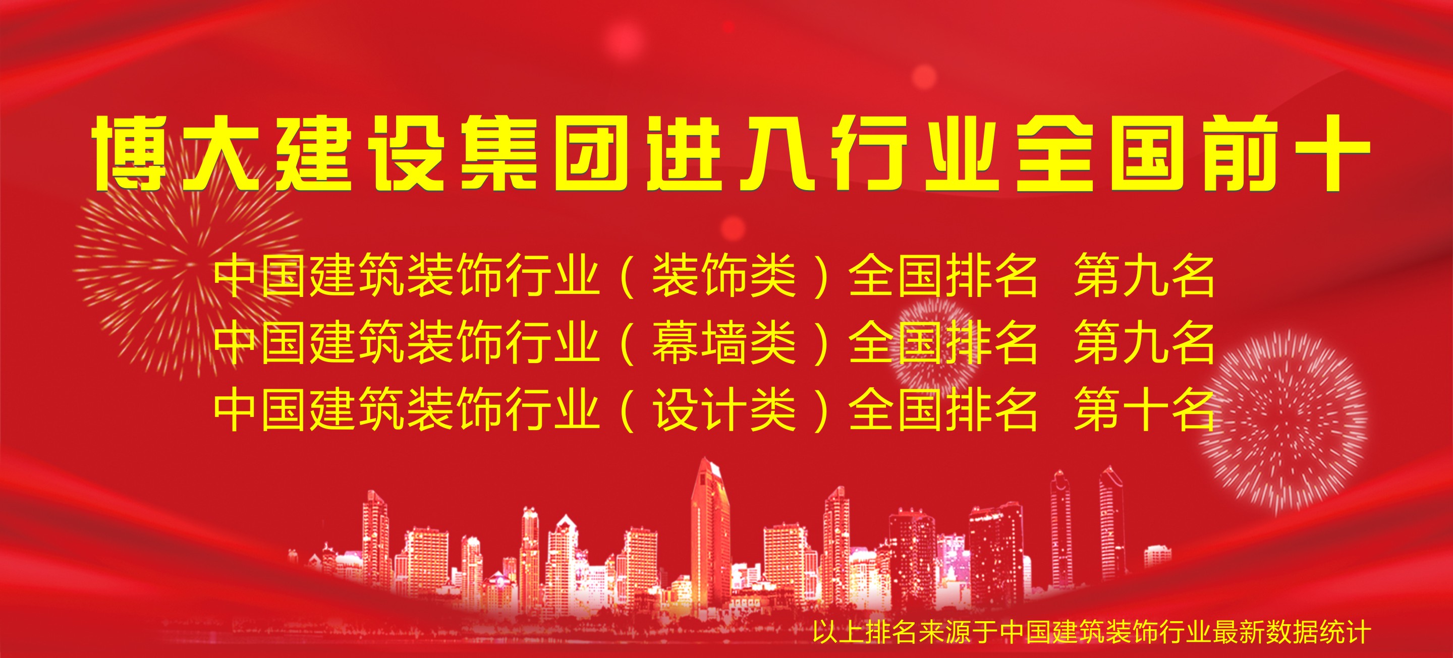 2019年1月9日,中國建筑工程裝飾頒獎大會在北京隆重舉行,根據中國建筑裝飾行業綜合數據統計,博大建設集團憑借綜合實力,以奮進姿態挺進行業全國前十,其中,裝飾類排名全國第九、幕墻類排名全國第九、設計類排名全國第十。