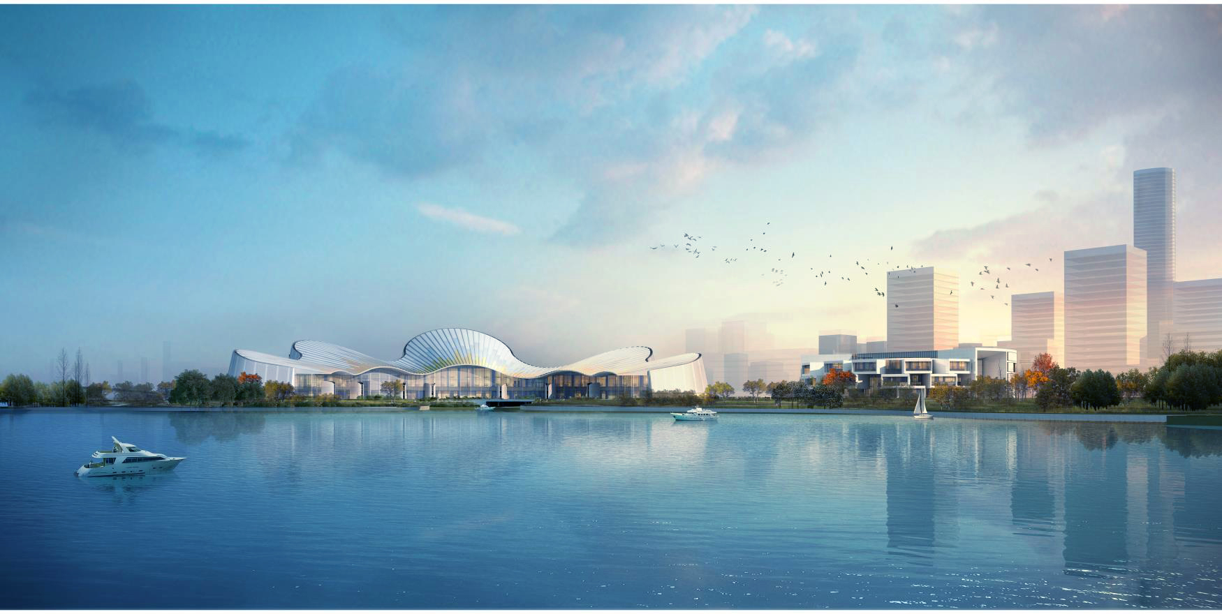 城市一側(cè),有著柔和曲線,潔白的舞臺(tái)塔,仿佛是一片輕盈的祥云,駐足在紫瑯湖畔,引導(dǎo)著行人來(lái)到湖邊,向他們展示優(yōu)美動(dòng)人的湖岸景觀。